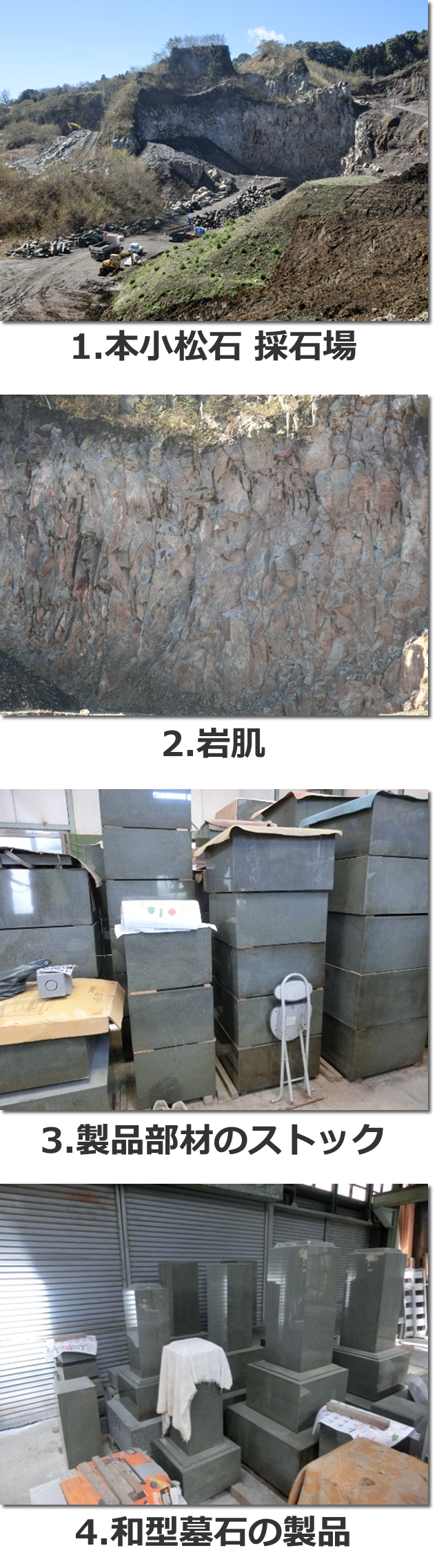 - ただ、この石は非常に希少性が高くお墓の様に大きな石材を採るのがとても難しい石でもあります。左の2.岩肌写真をご覧下さい。縦横斜めに無数の亀裂が入っていますよね。これが入った部分は当然お墓には使えません。だから山から採石した石材の数パーセントしか墓石の製品には使えないのです。